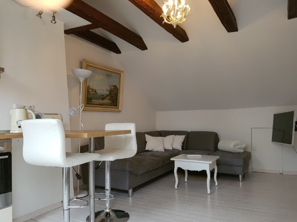 Das Apartment Shabby hat ca. 55 m² und ist komplett mit Holzfußboden, freiliegenden Deckenbalken und moderner Ausstattung: